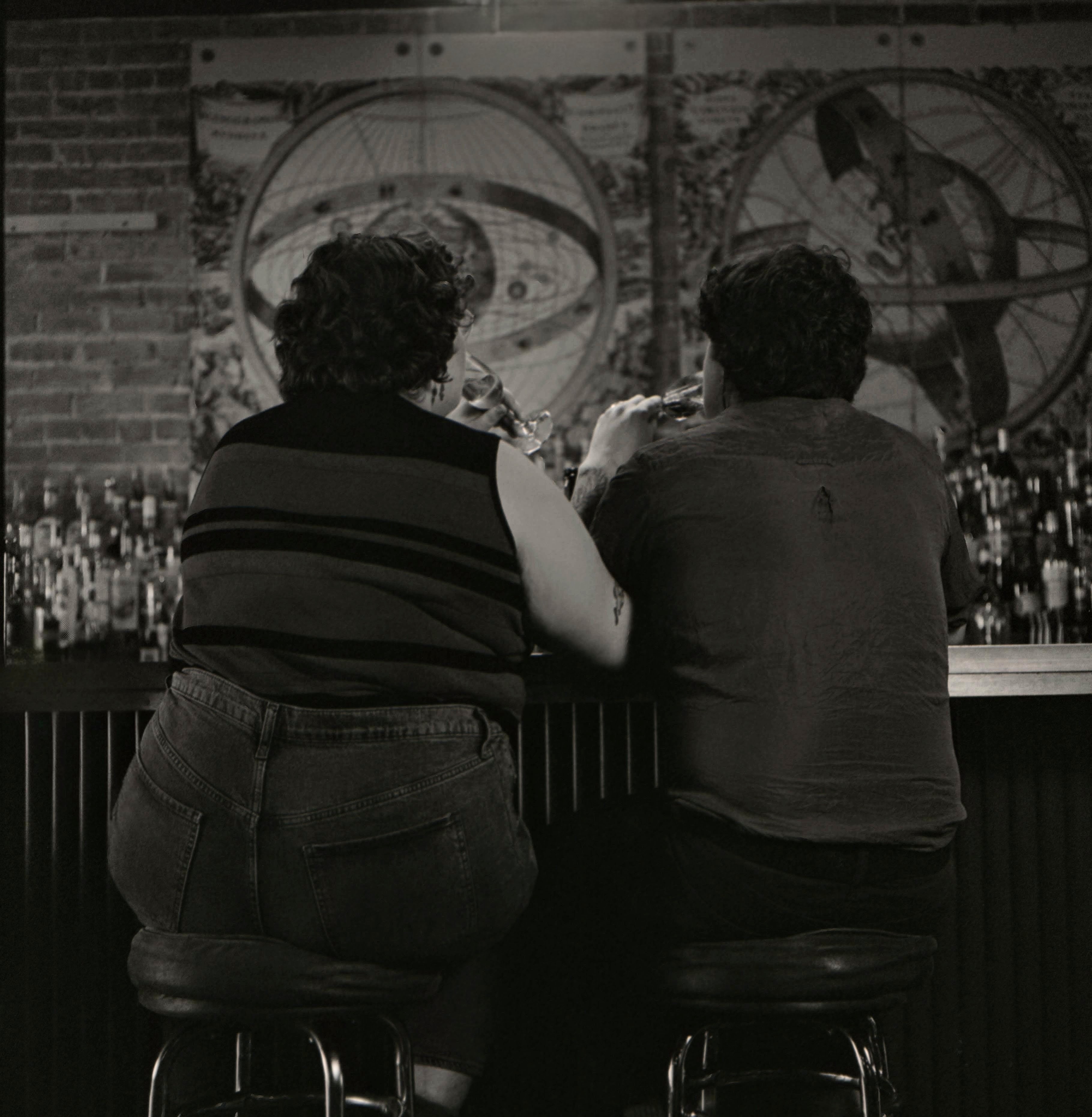 Together, Hannah and Jos have built a beautiful life full of friendship, joy, bike rides, wine tastings, crafts, movie nights, cute cats, cool art, good music, deep support for each other, and enough intellectual debate to keep them both on their toes. Just like everything else in their relationship, they decided to get engaged cooperatively. Over a period of three months, they had a series of lengthy discussions on whether, how, and when to get engaged. They decided they would announce the engagement with photos taken (and seen here!) by their friend and neighbor Jessi at Bar Ona where they had their first couple of dates.